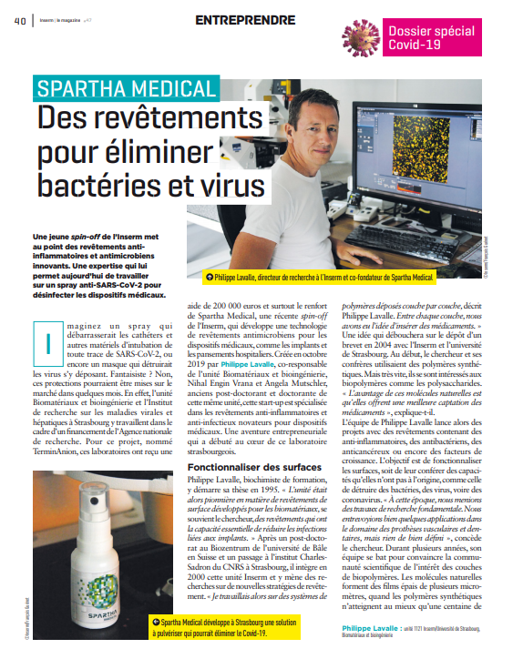 SPARTHA MEDICAL has developed an anti-SARS-CoV-2 spray thanks to its expertise in the development of coatings. This spray, mainly intended for the general public, eliminates microbes (viruses and bacteria) on nearly all surfaces. It can also be used in the medical field by application on catheters and masks for example.